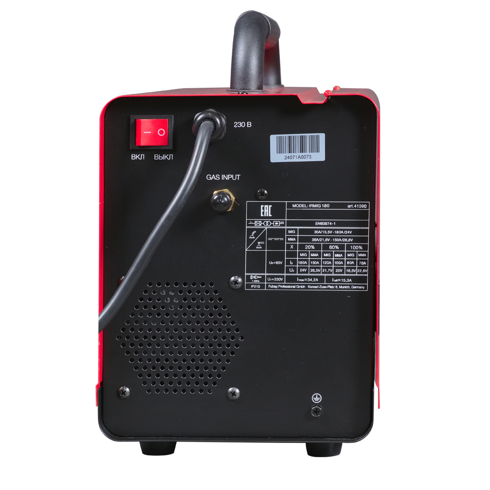 Все технические характеристики наглядно и подробно указаны на корпусе аппарата. Сварочный полуавтомат Fubag IRMIG 180 поставляется с полным набором аксессуаров для MIG/MAG и ММА сварки.